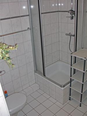 Ein Badezimmer mit Dusche/WC und Fön, sowie ein Flur mit Garderobe und Abstellraum.