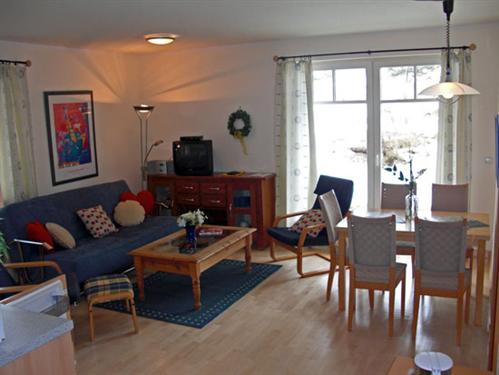 Das Wohnzimmer ist sehr bequem mit Sitz- und Essecke, Sat-TV und Radio.