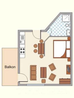 Es stehen Ihnen ein Wohnzimmer mit offener Küchenzeile und integriertem Schlafzimmer,